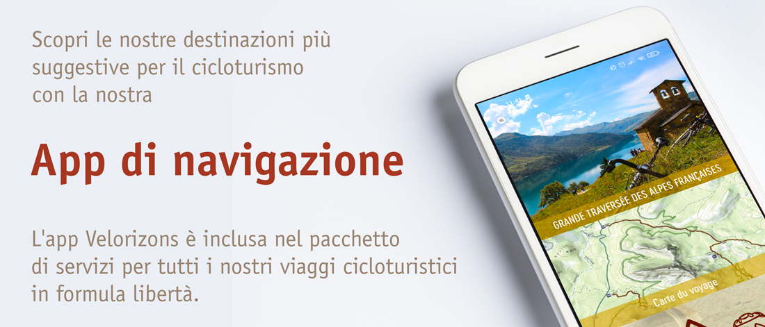 Seguite il vostro itinerario in tutta tranquillità! La nostra applicazione di navigazione "Vélorizons" vi permette di scaricare sul vostro smartphone tutte le informazioni importanti sul vostro tour in bicicletta e sul vostro percorso e di utilizzare la guida integrata (visiva e vocale) per la navigazione. Vi fornisce informazioni pratiche sul percorso, profili delle tappe, informazioni sui servizi prenotati e altri contatti utili a portata di mano.